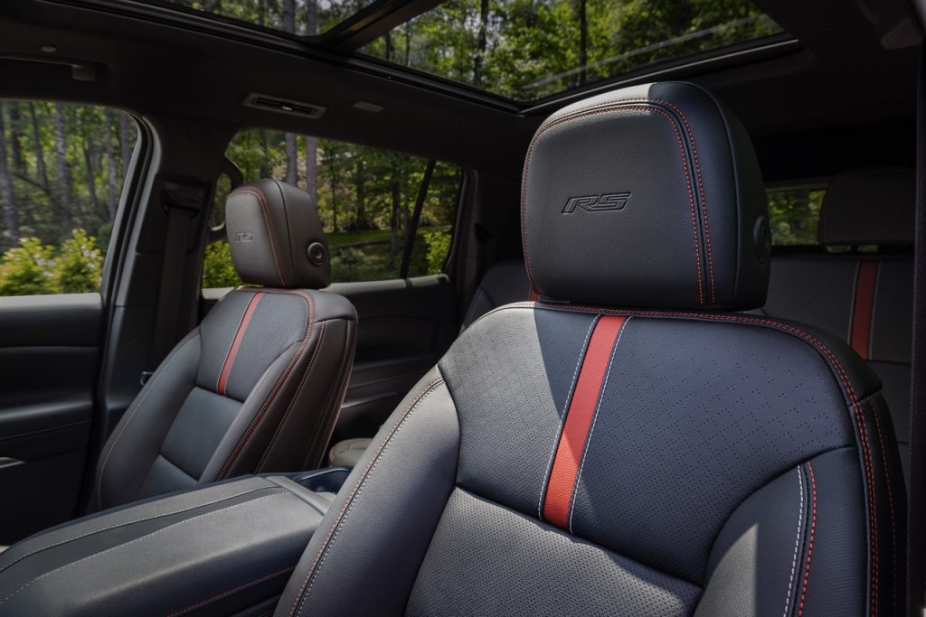 RS exterior and interior badging with blackout accent on the grille, roof rails, and moldings. Distinguishing interior cues include a three-spoke, flat-bottom steering wheel, headrest details, and a jet-black theme throughout the whole vehicle with red accents. RS stitching in the headrests & blackout accents are a personal favorite of mine!